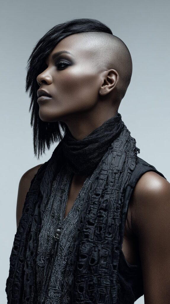 Make a bold statement with this disconnected bald fade that creates dramatic contrast between the closely shaved sides and the voluminous top. Unlike traditional fades that gradually transition, this style features a deliberate “disconnect” that creates a striking visual impact and showcases the beautiful texture of Black women’s short hair. The architectural precision of this cut makes it perfect for those with strong facial features who want a style that’s both artistic and attention-grabbing. Style the top with defining cream to enhance your natural texture and maximize the contrast.